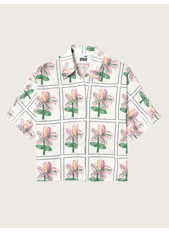 A new addition to the season's collection, the Alba shirt is crafted from cotton poplin. Evoking a sheet of stamps, the design is screen-printed and then machine-embroidered. Graphic and modern, it pairs perfectly with the Mona skirt in the same print.
