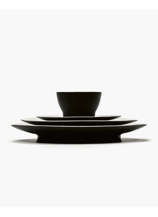 The tableware comes in three versions: Off-white silk matte glaze; in a timeless and warm ivory color, A black matte glaze on the outside with a glossy off-white glaze on the inside. The contrast between matte and glossy, but also the contrast between black and off-white, are typical of the Ann Demeulemeester style. And a matte green glaze that offers a green eating environment.