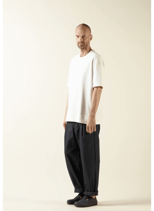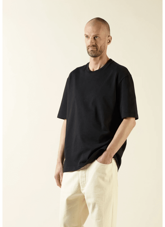 Our oversized short sleeve t-shirt is crafted from a heavy cotton jersey with an extra soft silky hand feel. It has a relaxed fit featuring a ribbed collar and a side slit hem with jersey tape detailing.