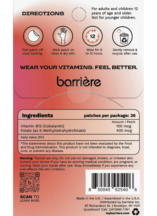 This mini patch is formulated with a full daily dose of Vitamin B12 and B9 (Folic Acid), which work together to support energy metabolism, vital red blood cell development, and healthy brain & nervous system function.