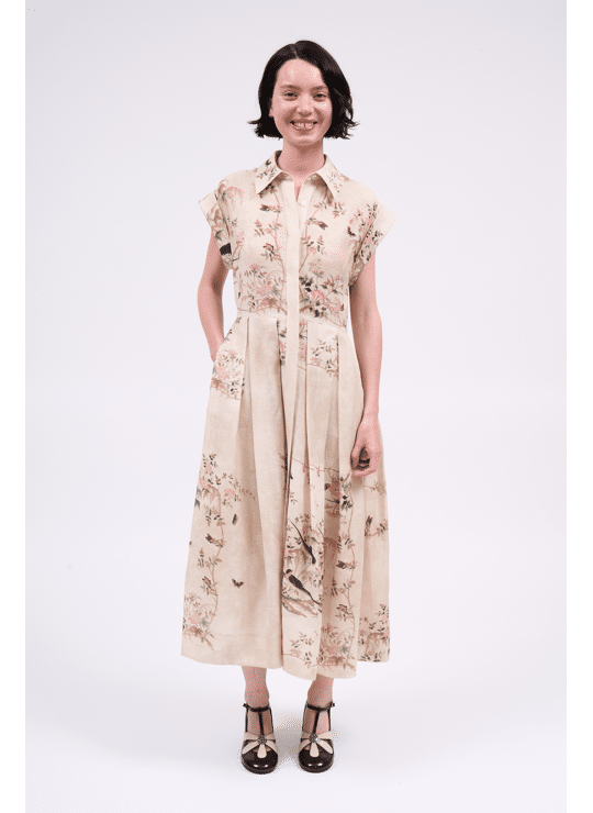 - Product: Linen and silk shirt dress with a placed print