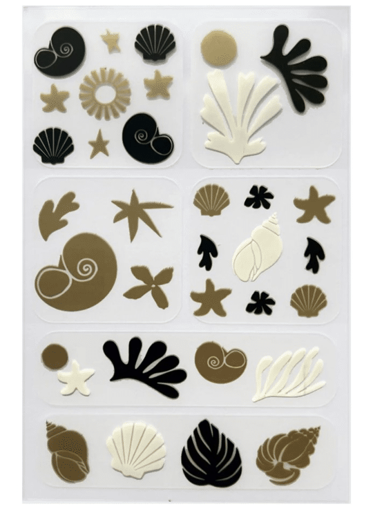 This pack includes 6 patches. Each patch features its own unique collage of abstract shapes rendered in a combination of black, white and metallic colorways on a clear backing made from 100% recycled PET.