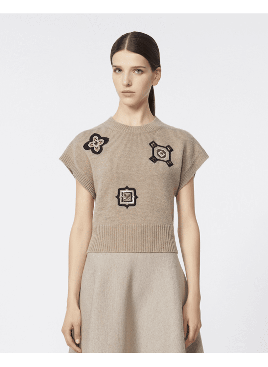 Cropped sweater decorated with sequin and rhinestone-embroidered detail.