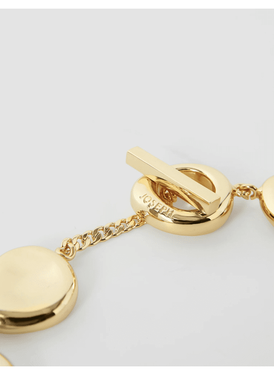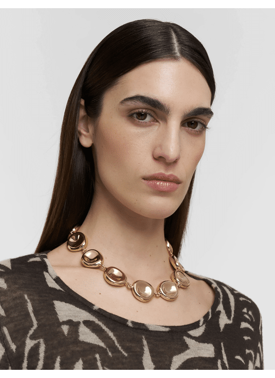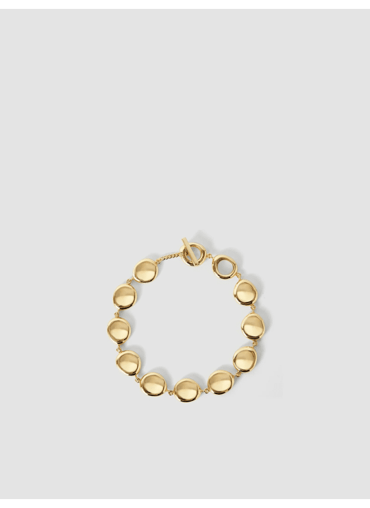 This elegant necklace features a series of sculptural gold-toned beans linked together in a fluid design, secured with a toggle clasp. The ‘bean’ is an exclusive studio-designed organic shape, appearing in various forms across the collection.