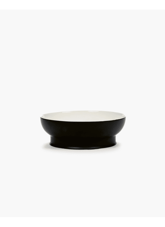 The fine Ra bowls sit on a pedestal, so they literally elevate the food served on them.There are three versions of the tableware e.g. with a black matte glaze on the outside with a glossy off-white glaze on the inside. The contrast between matte and glossy, but also the contrast between black and off-white, are typical of the Ann Demeulemeester style.