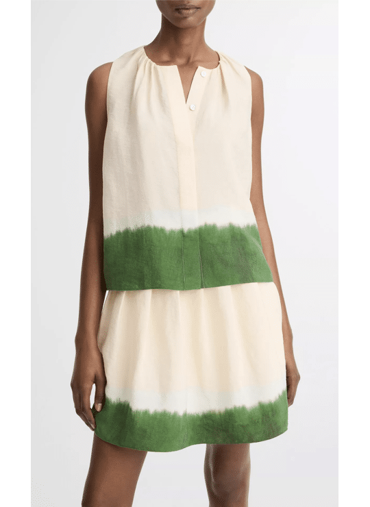 Rich shades of green underpin our palette this season. The vibrant dip-dyed hem of this airy A-line top complements its natural, softly textured finish. We made a matching pleated skirt, though it'll pair just as beautifully with your favorite denim or trouser.