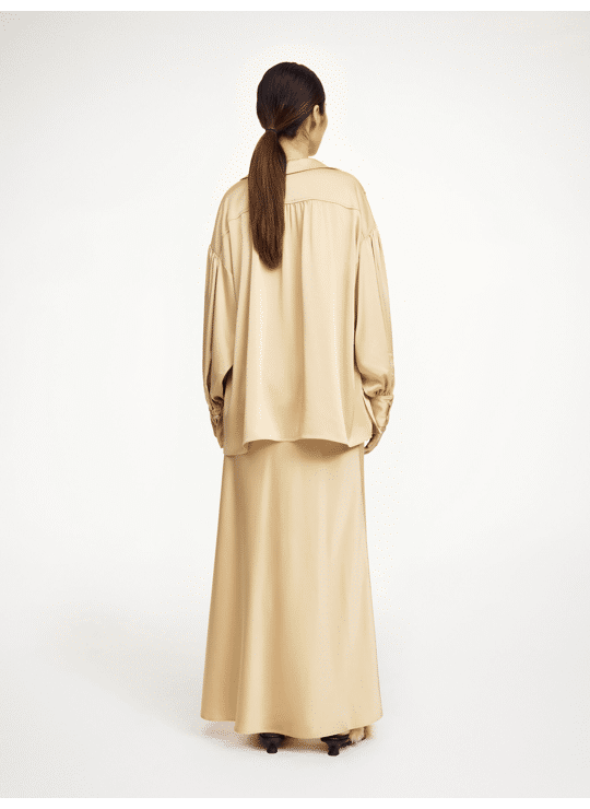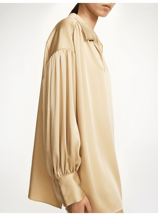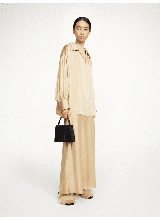 Designed in a minimalist silhouette that will transcend seasons, the Leonora blouse will slot right into your existing wardrobe – and work for numerous occasions. Made in a lush satin, the tunic-style design has a sharp collar, V-neck and buttoned cuffs. Notice the small, embroidered monogram.