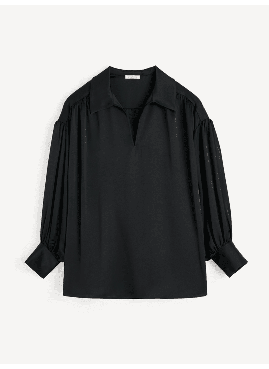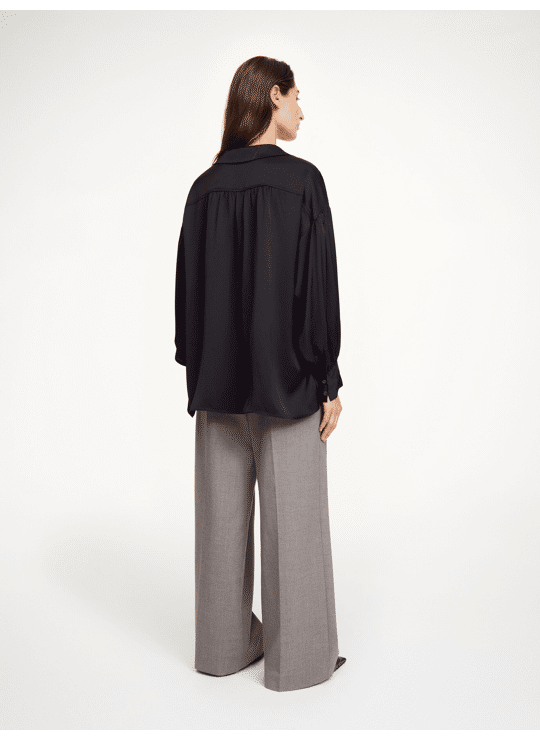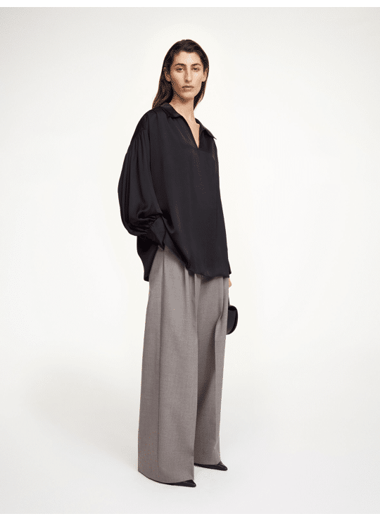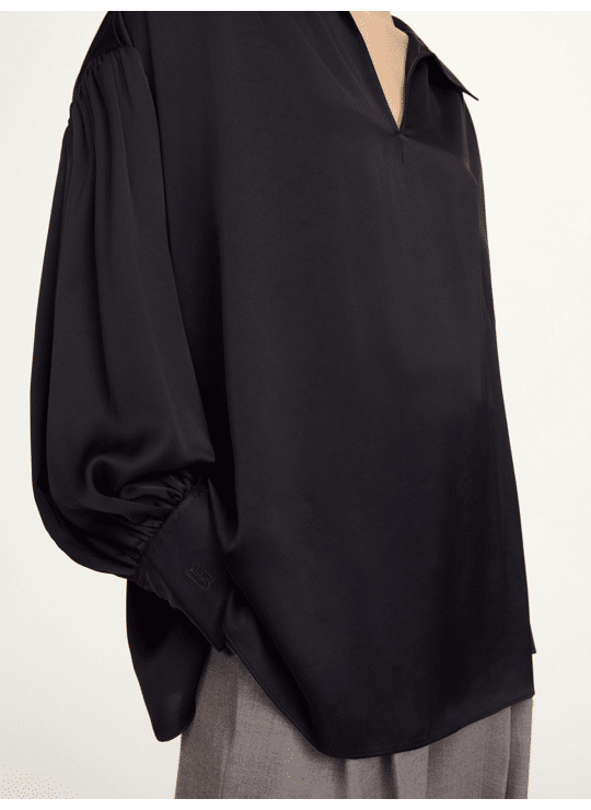 Designed in a minimalist silhouette that will transcend seasons, the Leonora blouse will slot right into your existing wardrobe – and work for numerous occasions. Made in a lush satin, the tunic-style design has a sharp collar, V-neck and buttoned cuffs. Notice the small, embroidered monogram.
