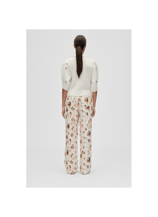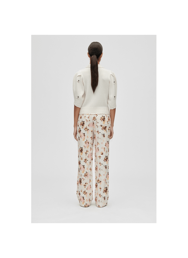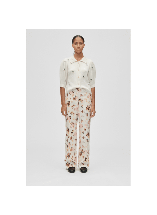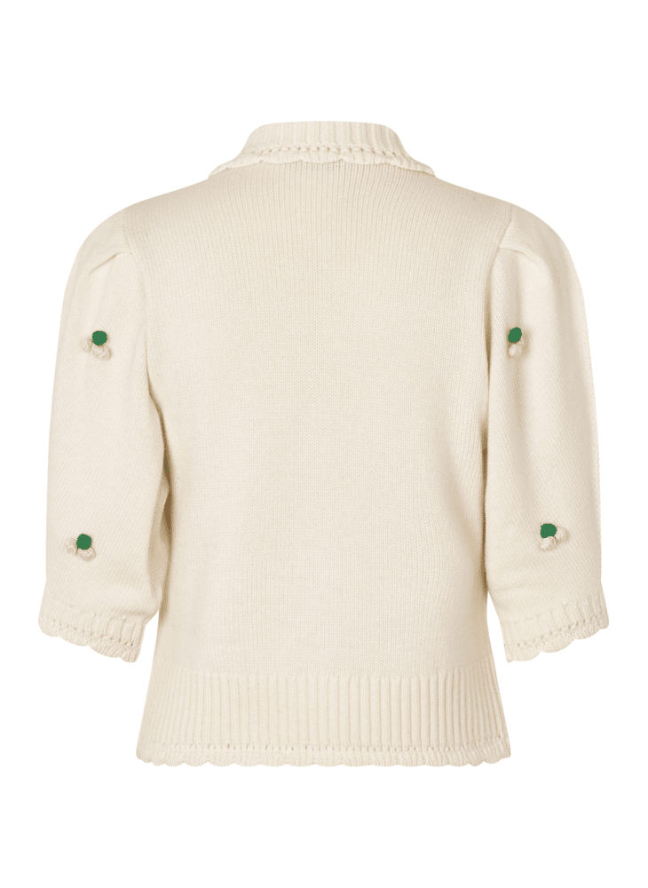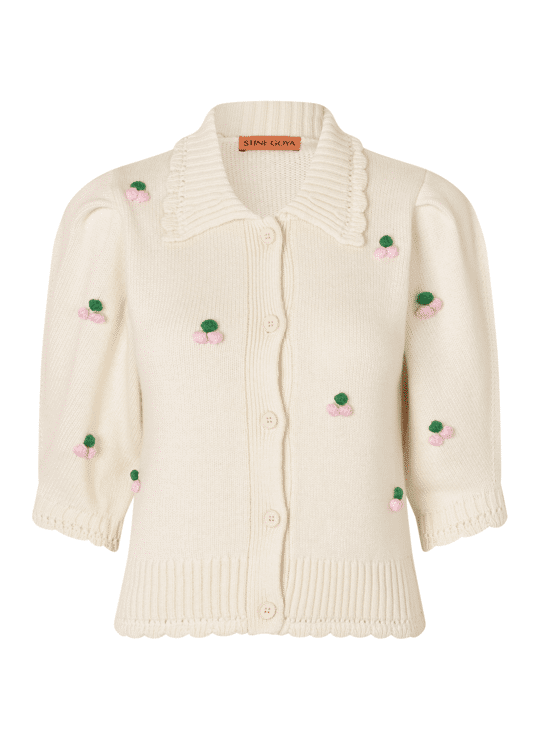 Knitted cardigan with puff sleeves and subtle floral embroidery. A soft, feminine piece with classic detailing.