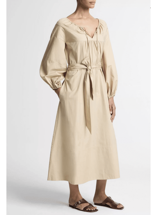 - Product: Shirred Cotton Belted Tie-Neck Dress