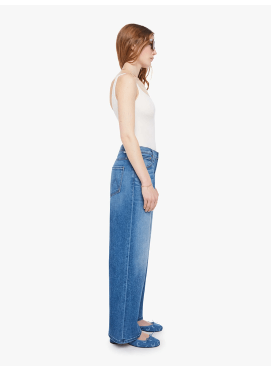 Riddle me that. Jeans designed to sit lower on the hips with a zip fly, loose wide leg and a clean ankle-length inseam. Cut from stretch denim, Fuzzy Wuzzy Was A Bear is a mid-blue with subtle whiskering and fading at the knees.