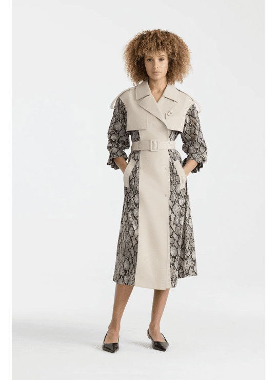 ZONOMI-PR is a long double-breasted trench coat made from soft crinkle fabric for a structured yet fluid silhouette. Water-repellent, windproof, and breathable, the shell features bold snake pattern and taupe colour blocking throughout. Tailored with shoulder tabs, a belted waist, and welt pockets, it balances classic trench detailing with a technical edge. A mixed-media construction and balloon sleeves lend dimension and ease, while a rain shedder and mesh lining enhance functionality.